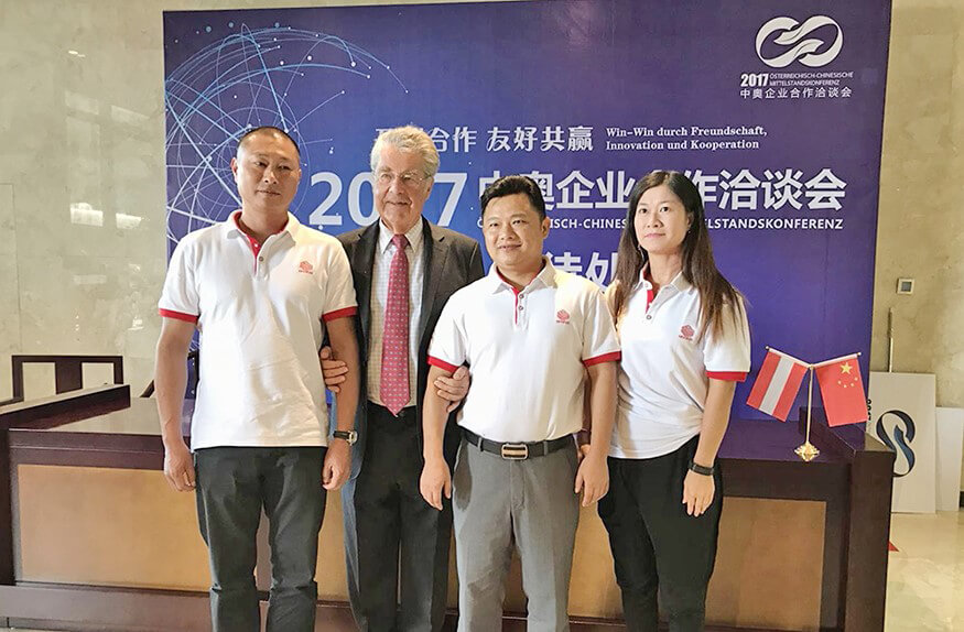 奥地利前总统海因茨·菲舍尔与米兰milan智能副总裁戴宝、揭阳分公司总经理林浩生、公司总裁助理郑庆丽合影