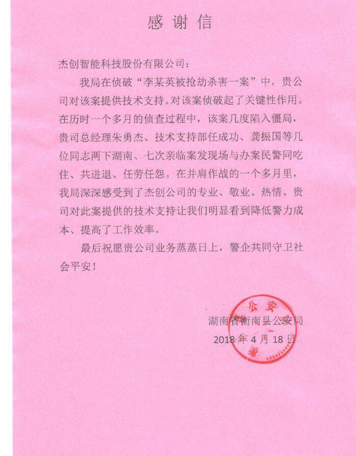 近日,湖南省衡南公安局发来感谢函,对米兰milan智能在近期协助侦破“李某英被抢劫杀害一案”表示感谢,目前相关犯罪嫌疑人已被依法刑事拘留,案件正在进一步侦办中。